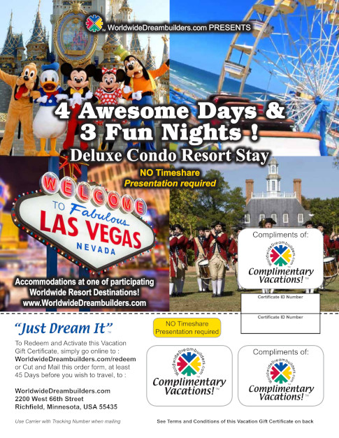 NO timeshare presentations are required to redeem this Vacation Gift Certificate.